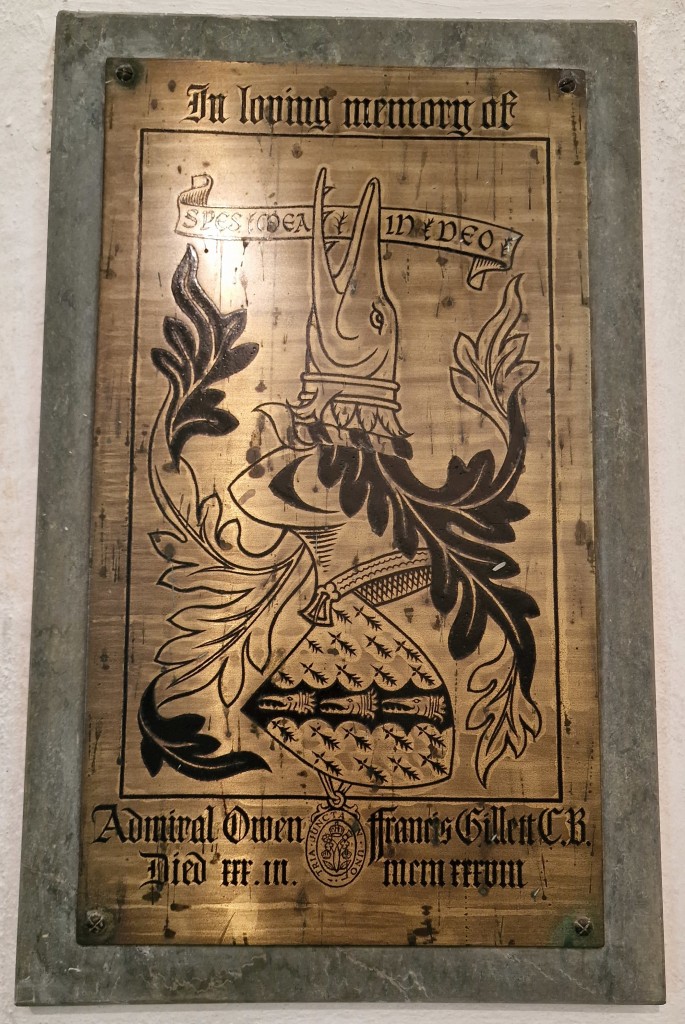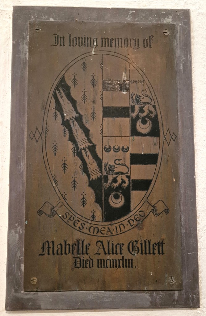 Admiral Owen Francis Gillett died on 21 March 1938 and was buried at Halvergate. May died in 1943. They are both commemorated by brass plates, obviously engraved by the same company, Owen’s having an achievement of arms and May’s an oval of impaled arms.