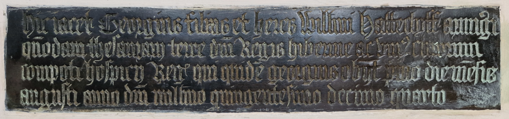 Hic jacet Georgius, filius et heres Willielmi HATTECLYFF, armigeri, quondam thesaurarij terre domini regis Hibernie, ac unius clericorum compoti hospicij regis; qui quidem Georgius obijt primo die mensis Augusti, anno domini millesimo quingentesimo decimo quarto.