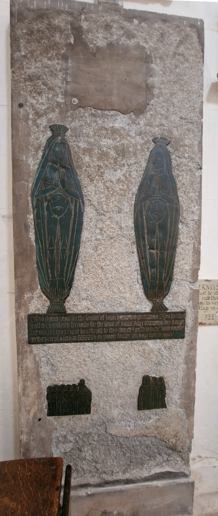 The remaining pre-Reformation brasses of the church of the Holy Trinity at Michinhampton are set together on the north wall as you walk into the church from the west door; on the opposite wall are a larger number of later brasses, perhaps originally from the churchyard where a large number of others remain. On its original Purbeck marble slab are the effigies of John Hampton, gentleman, and his family. John and his wife Elyn are shown in their shrouds but their children, six sons and three daughters, are not. The son and daughter shown most prominently are dressed as a monk and, at first sight, a nun. The inscription reads: