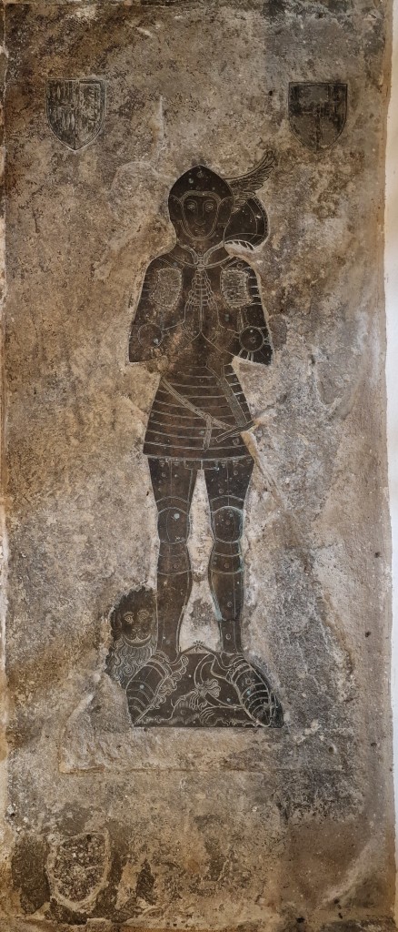 The figure of Thomas Bekyngham (or Beckingham), esquire, is in armour and has slight damage: the upper part of the helm on which his head rests, the scabbard of his sword and a small part of his lion foot-rest. We know his identity because although the inscription is lost, two shields remain, one of them with the arms of Bekyngham.